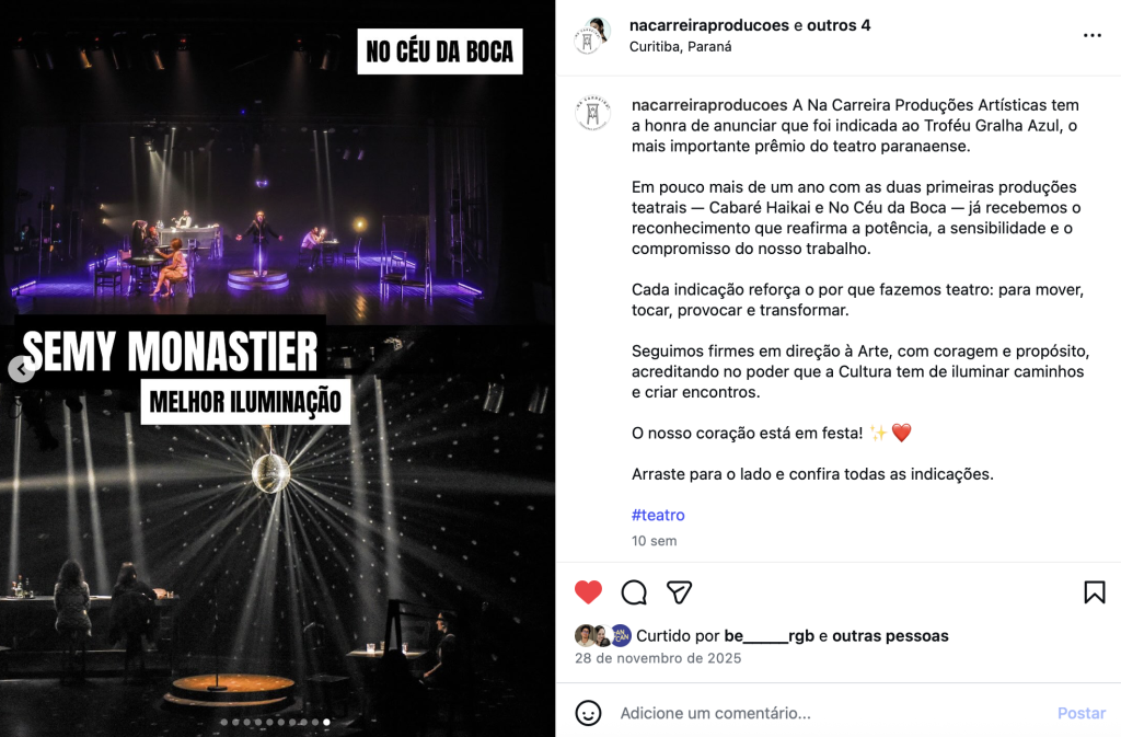 No Céu da Boca Espetáculo da Na Carreira Produções – indicado ao prêmio Gralha Azul de melhor iluminação. Curitiba 2025 Category: ILUMINAÇÃO Tags: Iluminação